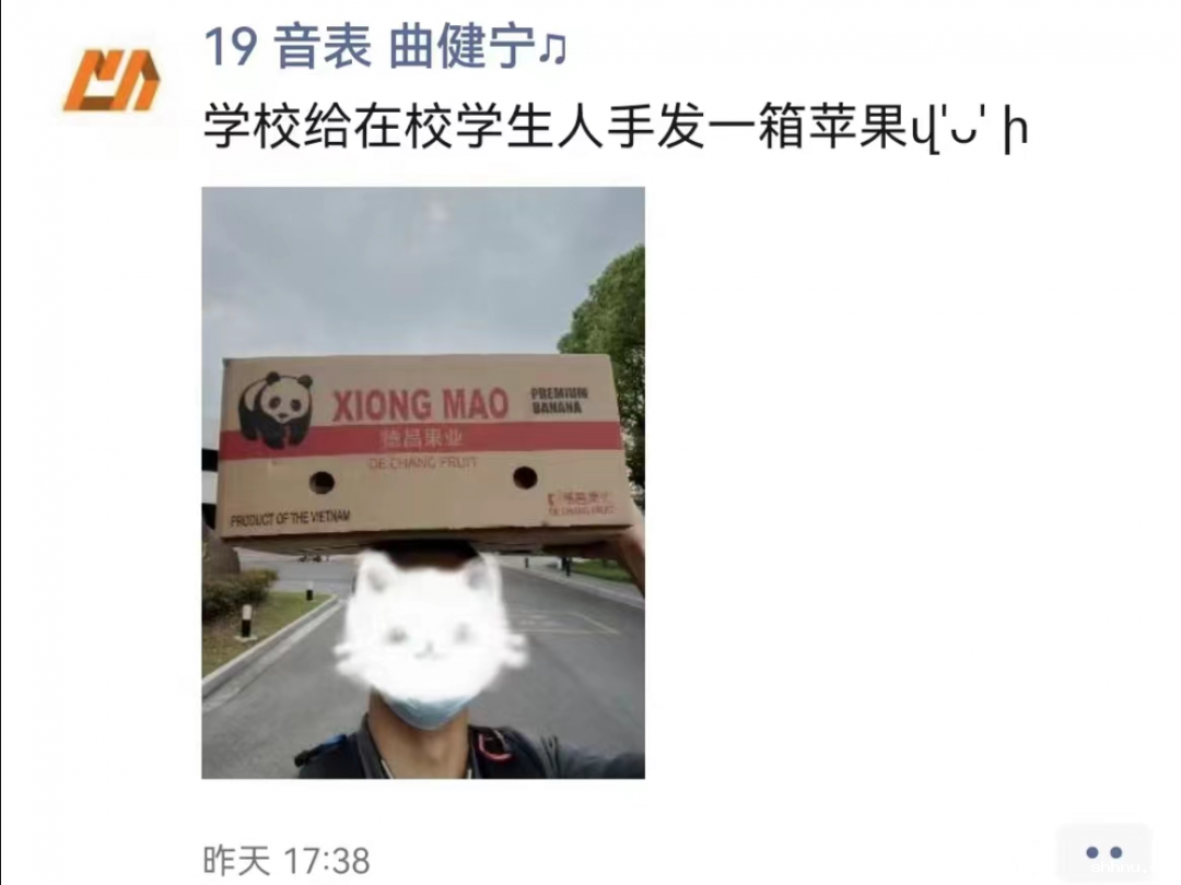 对于18位在校研究生和本科生,召开在校生座谈会,及时了解同学们的需求,提供最大程度地帮助和支持。如学院开放相应的琴房,供在校学生上课和练琴,并及时做好消杀。在得知在校生对于水果的需求较高且购买有难度后,及时采购,27日上午,经过精挑细选的爱心苹果在严格消杀之后,由住校辅导员有序分发到每一位在校学生手中。面对来自学院送来的关爱,学生们甜在嘴上,暖在心里,纷纷在朋友圈里表达了感谢。