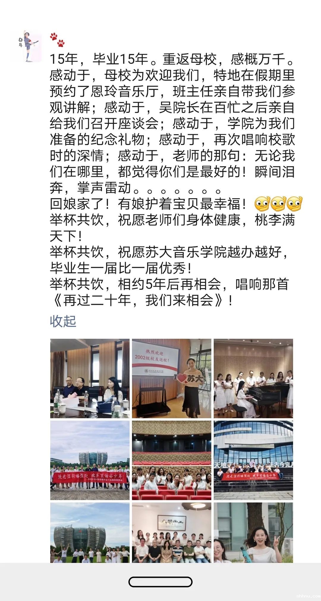 相聚时难,别亦难。回望当年,同学们怀揣着对音乐的热爱、对教育事业的追求来到苏大。在校四年接受了老师们的谆谆教诲、精心培养,毕业时同学们满怀职业理想踏入各自的工作岗位、扬帆远航。十五年后,同学们铭记着苏大校训、师长的期望、音乐专业的责任在各自岗位上发光发热。最后同学们饱含深情唱起了东吴校歌,表示将以更优异的成绩回报母校!师恩情深,同学谊厚,离苏后的校友纷纷秀起了朋友圈,寄以无限深情与祝福!
