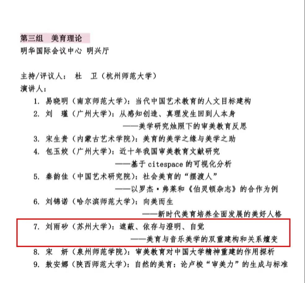 群贤论美,灵思辉映。本次国际学术会议的研讨主题为美学的基本问题,会议围绕中国古典美学、西方美学、当代美学、生态美学、美育实践、身体美学等问题展开讨论。我院青年教师刘雨矽博士作为参会代表,以论文《遮蔽、依存与澄明、自觉——美育与音乐美学的双重建构和关系嬗变》参与本次国际研讨会第三分组“美育理论”的发言与研讨。