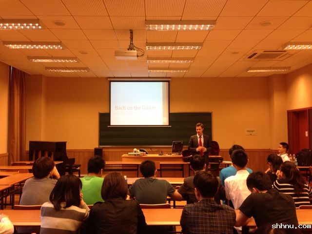 今年10月10日,我院Matthias Lang教授作为主讲人在上海bw必威西汉姆联官网首页举办了吉他学术讲座:《Bach on the Guitar: Principles and Examples of an applied Baroque Sound》。在讲座过程中,Matthias Lang教授一边讲解,一边用吉他示范了一些具体的音乐片段。之后,他又为参加讲座的叶登民教授和学生们演奏了他自己为吉他改编的《巴赫无伴奏小提琴组曲第二号(BWV1003)》。