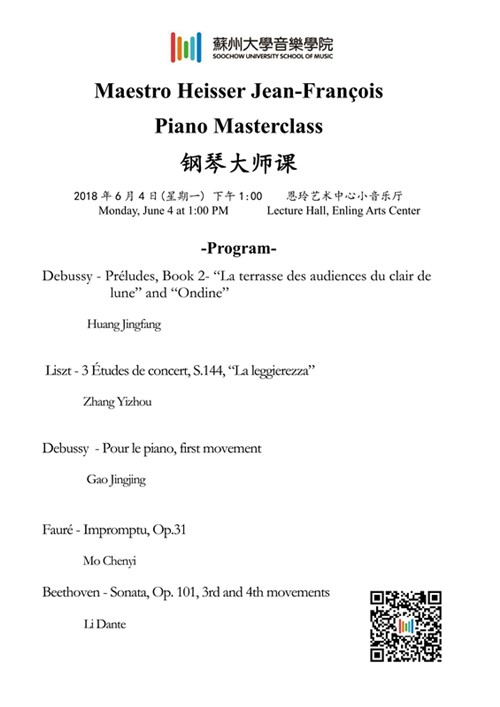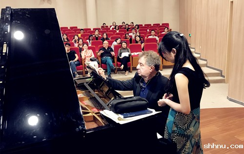 来自音乐表演专业和音乐教育专业的黄靖芳、张译舟、高晶晶、莫宸怡、李丹特五位同学分别演奏了德彪西、福雷、李斯特和贝多芬的作品,获得了大师的亲自指导。