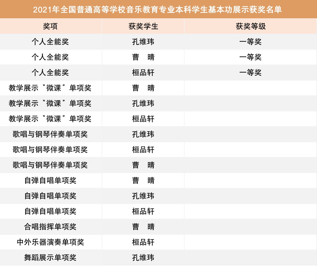 近日,教育部公布了2021年全国普通高等学校音乐教育专业本科学生和教师基本功展示评选结果。苏州大学在本次展示活动中,荣获团体奖一等奖(序列第一)、高校优秀组织奖;必威BetWay在线官网共荣获教师个人全能奖一等奖3项、单项奖8项;学生荣获个人全能奖一等奖3项、个人单项奖12项。这是bw必威西汉姆联官网首页历次参加此类展示活动取得的最好成绩,所获奖项之高、之多在全国高校中亦名列前茅。